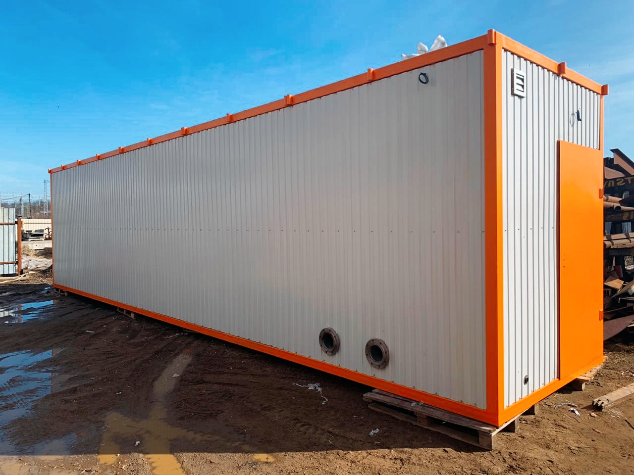 Изготавливается из листовой стали, защищенной антикоррозийным покрытием от действия сточных вод изнутри и полиуретановой грунт-эмалью снаружи. Корпус установки утеплен базальтовым минераловатным утеплителем. Наружная обшивка стен - стальной профлист.